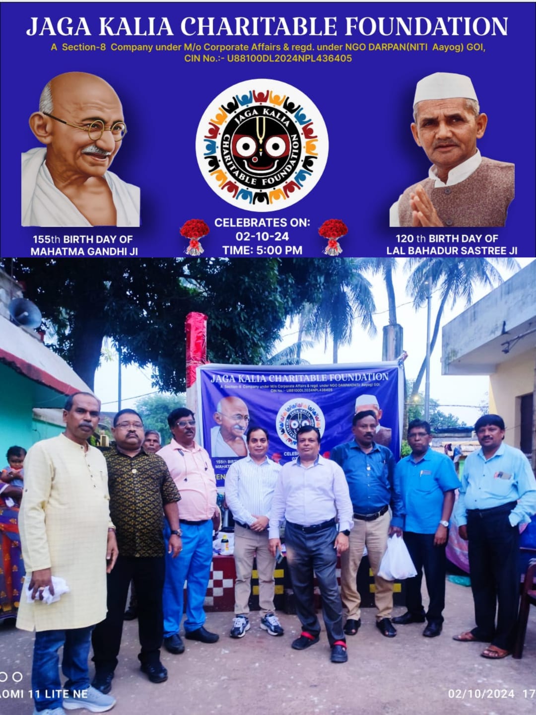 2 ଅକ୍ଟୋବର ଗାନ୍ଧୀ ଜୟନ୍ତୀ ଶୁଭ ଅବସରରେ, ସ୍ୱେଚ୍ଛାସେବୀ ସଂଗଠନ ଜଗା କାଳିଆ ଚାରିଟେବୁଲ୍ ଫାଉଣ୍ଡେସନ୍ ଦ୍ୱାରା ଚେୟାରମ୍ୟାନ୍ ଆଡଭୋକେଟ୍ ଉମାକାନ୍ତ ଜେନାଙ୍କ ଅଧ୍ୟକ୍ଷତାରେ ଗୋପବନ୍ଧୁ କଲୋନୀ,ଭୁବନେଶ୍ୱରରେ ଏକ ସ୍ବେଚ୍ଛାସେବୀ ଦାନ ଶିବିର ଆୟୋଜନ ହୋଇଯାଇଅଛି,ଏହି କାର୍ଯ୍ୟକ୍ରମରେ ମୁଖ୍ୟ ସଦସ୍ୟ ଶ୍ରୀ କ୍ରୁପାନିଧି ବିଶ୍ୱାଳ (ଉପାଧ୍ୟକ୍ଷ- କାର୍ଯ୍ୟ), ପ୍ରଫେସର ଜୟନ୍ତ କୁମାର ସାହୁ (ସଚିବ), ଶ୍ରୀ ମନୋଜ କୁମାର ପାଣିଗ୍ରାହି (ଯୁଗ୍ମ ସଚିବ), ଶ୍ରୀମତୀ ପାୟଲ ଆଚାର୍ଯ୍ୟ (ଯୁଗ୍ମ ସଚିବ) ଏବଂ Patrons ଶ୍ରୀ ପ୍ରଭାତ କୁମାର ଜେନା , ଶ୍ରୀ ଅଜୟ କୁମାର ବିଶ୍ୱାଳ ଏବଂ ରାମ ପ୍ରସାଦ ପାତ୍ର ଆଦି ଯୋଗ ଦେଇ କାର୍ଯ୍ୟକ୍ରମ ଟିର ଶୁଭାରମ୍ଭ କରିଥିଲେ |